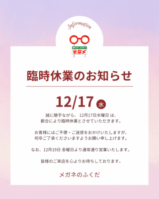 12月17日臨時休業のお知らせ - 山口市大内千坊(山口県)のメガネ店 | メガネのふくだ