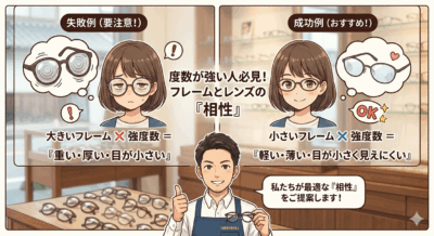 - プロの視点: 度数とレンズとフレームの相性を一番に考えます