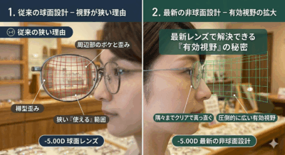 S-5.00D以上の度数の方は、この「有効視野の広さ」の違いをはっきりと体感できる境界線です。